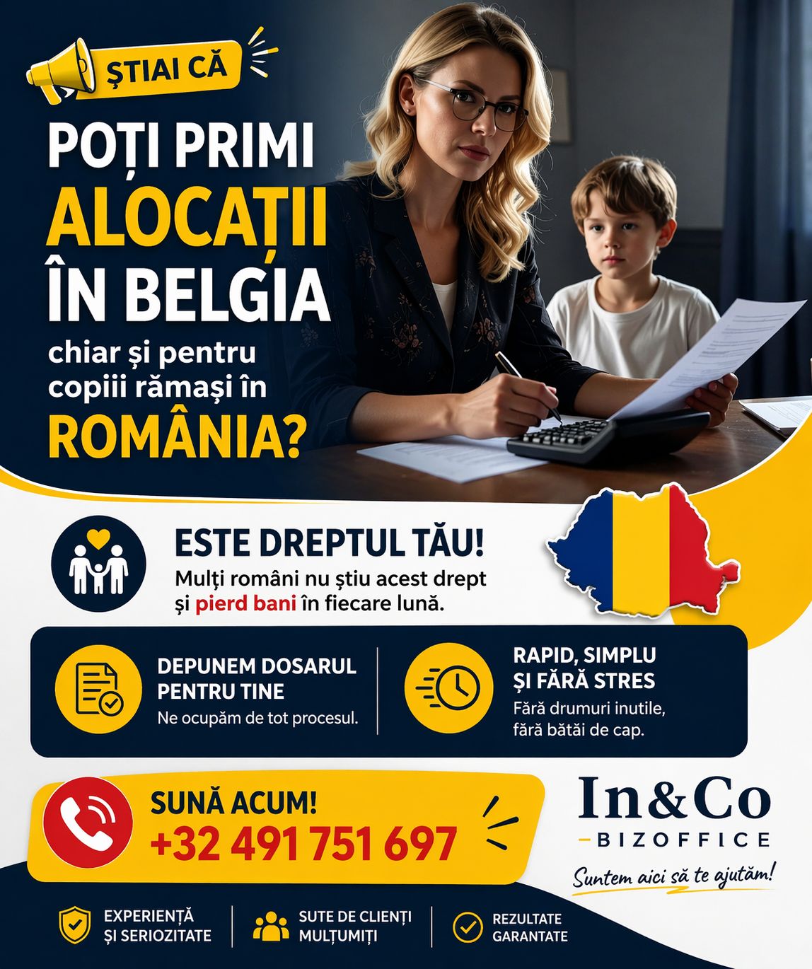 Știai că poți primi alocații în Belgia chiar dacă copilul tău este în România? Mulți români nu știu acest drept și pierd bani lună de lună. In&Co Bizoffice se ocupă de tot dosarul pentru tine, rapid și fără stres. Contact: +32 491 751 697